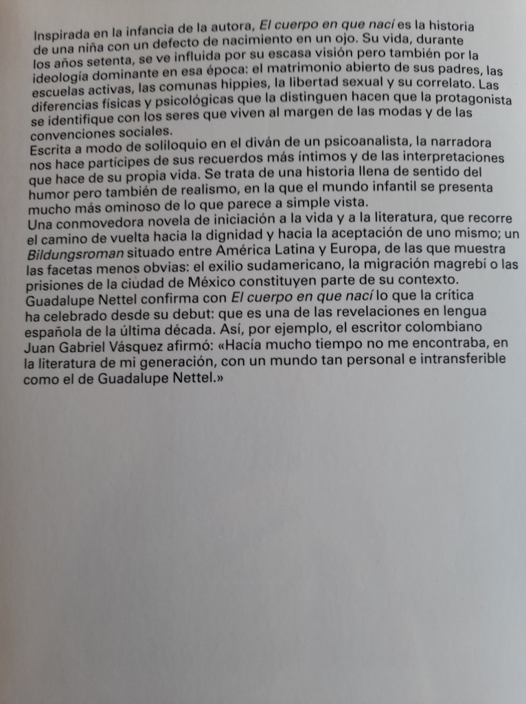 Cuando la realidad biográfica se mezcla o se recrea con ficción esta cuestión cobra importancia. Personalmente me apasionan las vidas de gente bien y celebro que algunas de ellas tengan el impulso artístico de expresarse o recrearse como obra. «El cuerpo en que nací» tiene ingredientes de sobra para procurar un relato jugoso, empezando por el defecto en el ojo que condiciona el desarrollo desde niña de la propia Guadalupe Nettel y siguiendo por la condición liberal (en el sentido más humanista y pijo) de sus padres, que practican la libertad sexual, conviven en comunas hippies y, en definitiva, buscan alternativas a una vida normal que tienen amortizada y superada. Sin embargo no acierta Guadalupe Nettel a crear un relato con la mínima pulsión narrativa y por todo pasa de manera superficial y sosa, como si el lector de pueblo que tiene una librería aún no sabe muy bien por qué (pero ha de ser porque le gustan los libros o porque quiere que se note que le gustan los libros) supiera de qué puñetas le está hablando. Una pena, y un rollo, vaya, una decepción que sin embargo me ha abierto el apetito y me ha llevado a leer la tercera parte de la obra autobiográfica de Knausgard (la que habla de su infancia),quien seguramente no tiene mucho más que contar (o puede que menos) y cuenta, sin embargo, mucho más.
