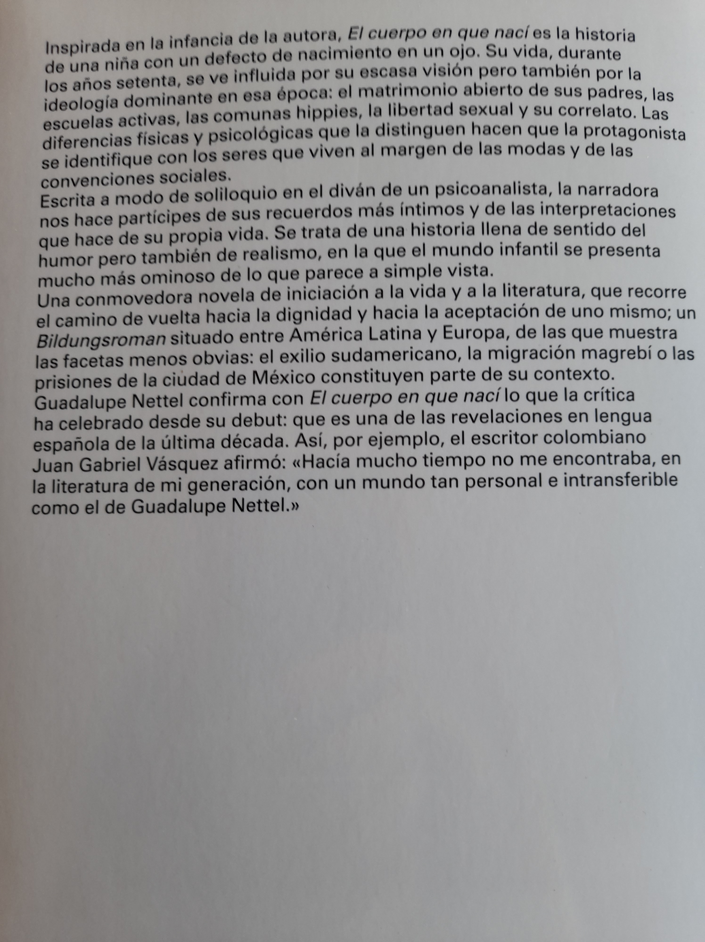 Cuando la realidad biográfica se mezcla o se recrea con ficción esta cuestión cobra importancia. Personalmente me apasionan las vidas de gente bien y celebro que algunas de ellas tengan el impulso artístico de expresarse o recrearse como obra. «El cuerpo en que nací» tiene ingredientes de sobra para procurar un relato jugoso, empezando por el defecto en el ojo que condiciona el desarrollo desde niña de la propia Guadalupe Nettel y siguiendo por la condición liberal (en el sentido más humanista y pijo) de sus padres, que practican la libertad sexual, conviven en comunas hippies y, en definitiva, buscan alternativas a una vida normal que tienen amortizada y superada. Sin embargo no acierta Guadalupe Nettel a crear un relato con la mínima pulsión narrativa y por todo pasa de manera superficial y sosa, como si el lector de pueblo que tiene una librería aún no sabe muy bien por qué (pero ha de ser porque le gustan los libros o porque quiere que se note que le gustan los libros) supiera de qué puñetas le está hablando. Una pena, y un rollo, vaya, una decepción que sin embargo me ha abierto el apetito y me ha llevado a leer la tercera parte de la obra autobiográfica de Knausgard (la que habla de su infancia),quien seguramente no tiene mucho más que contar (o puede que menos) y cuenta, sin embargo, mucho más.