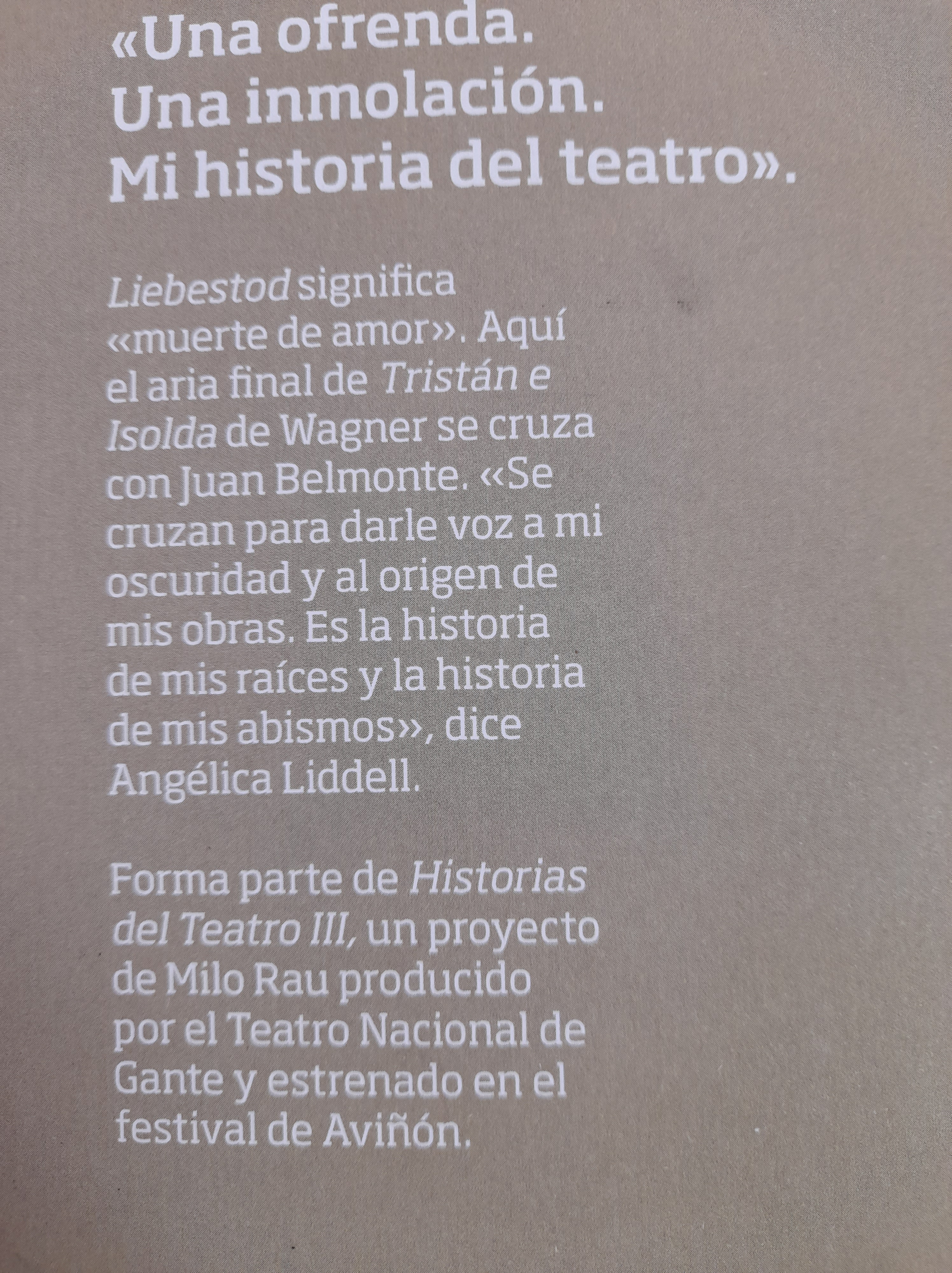 Sólo te hace falta morir en la plaza Javier Pérez Lázaro Memorias, Teatro 21 septiembre, 2023 1 minuto Angélica Liddell, 2021. Ed La uña rota, 2021. 94 páginas. Pvp: 10 € Comparte: Compartir en X (Se abre en una ventana nueva) X Comparte en Facebook (Se abre en una ventana nueva) Facebook Me gusta Cargando... Relacionado Publicado por Javier Pérez Lázaro Ver todas las entradas de Javier Pérez Lázaro Publicado 21 septiembre, 2023